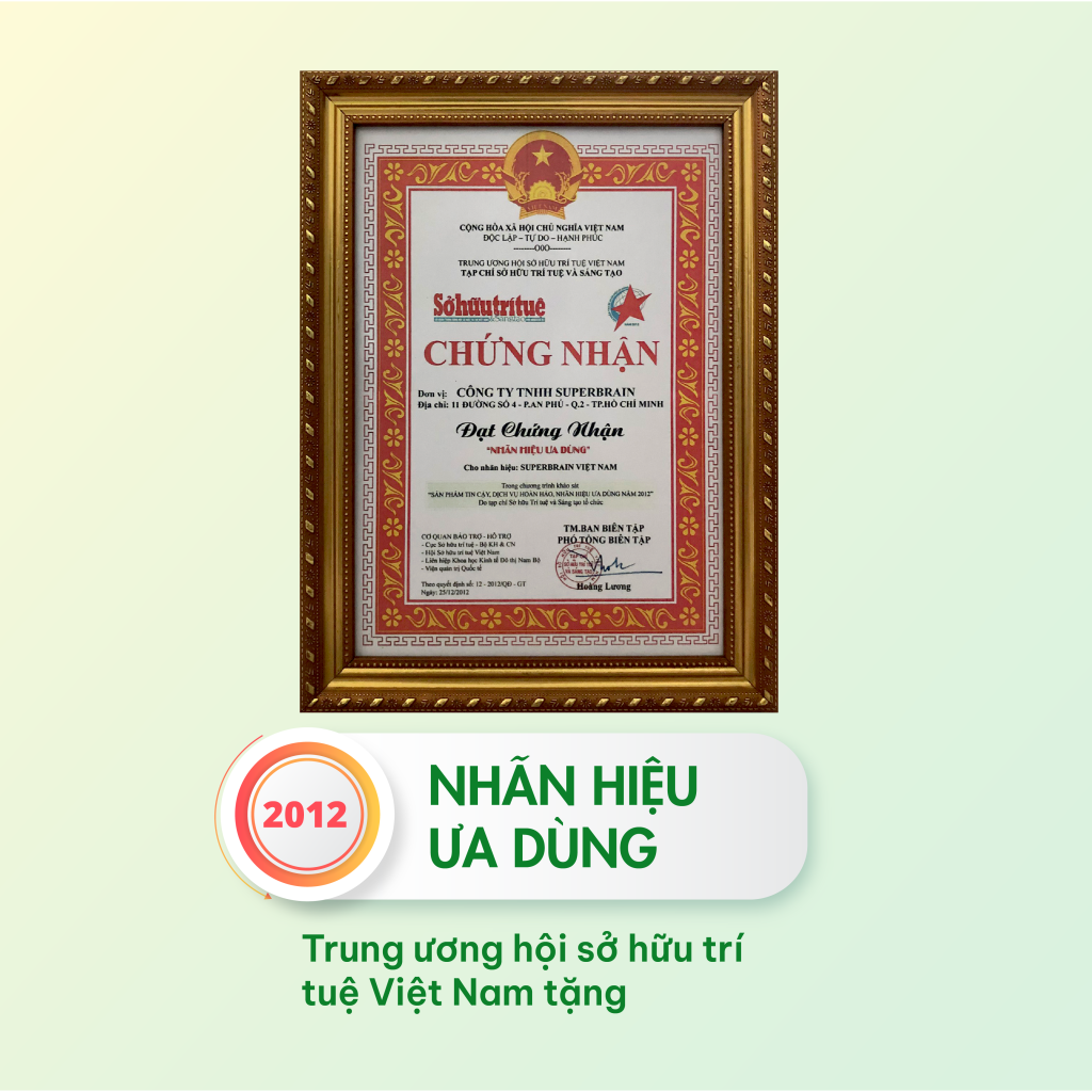 - Chứng nhận Danh hiệu “NHÃN HIỆU ƯA DÙNG NĂM 2012”, do TRUNG ƯƠNG HỘI SỞ HỮU TRÍ TUỆ VIỆT NAM trao tặng.
