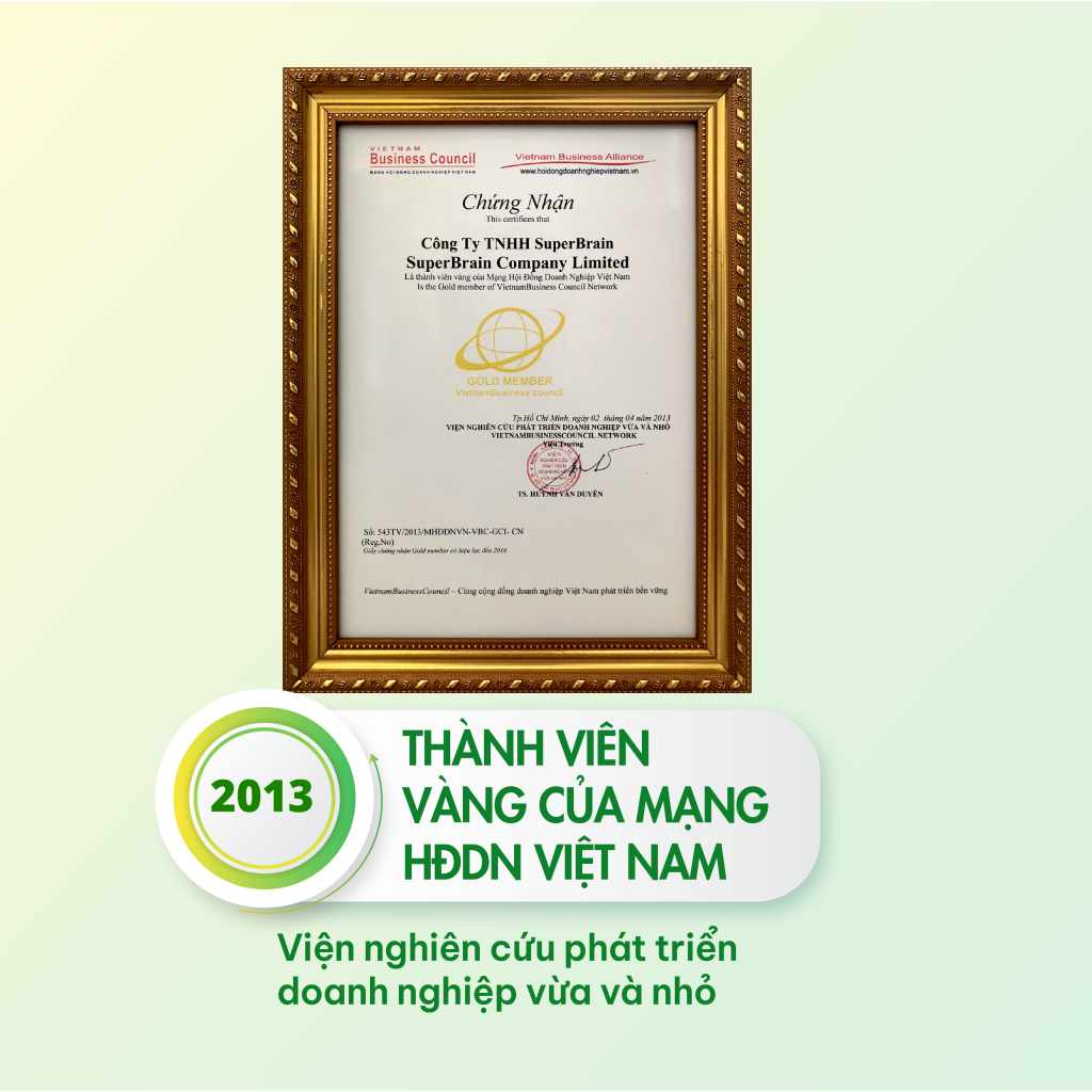 - Chứng nhận Danh hiệu “THÀNH VIÊN VÀNG 2013 CỦA MẠNG HỘI ĐỒNG DOANH NGHIỆP VIỆT NAM” do VIỆN NGHIÊN CỨU PHÁT TRIỂN DOANH NGHIỆP VỪA VÀ NHỎ trao tặng.
