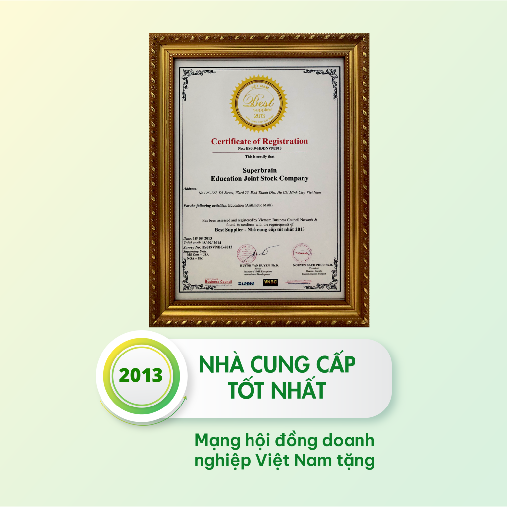 Năm 2010 Superbrain được ra đời từ tình yêu thương và mong muốn đem lại những điều tốt đẹp dành cho chính con mình. Với giá trị tuyệt vời mà phương pháp mang lại cho những đứa con của mình, chương trình Toán trí tuệ Superbrain đã lan tỏa rộng rãi khắp cả nước và lịch sử của Superbrain trên hành trình khơi dậy tiềm năng trí tuệ trẻ sẽ tiếp tục được ghi dài hơn bởi sự tin tưởng từ quý phụ huynh, sự hứng thú và tiến bộ của học viên, sự nhiệt huyết và năng lượng của từng thầy cô và từ những người có chung đam mê, sứ mệnh với sự nghiệp giáo dục.
