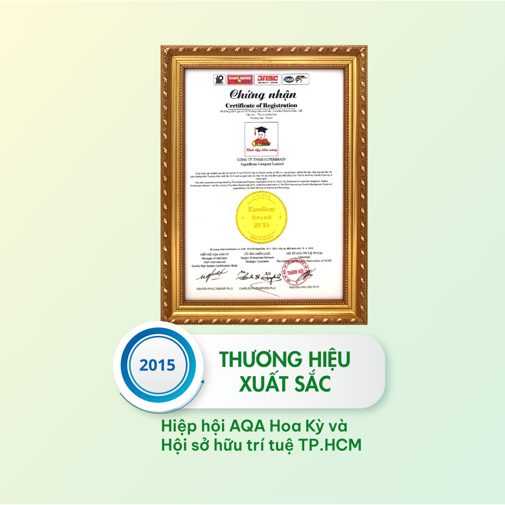 - Chứng nhận Danh hiệu “THƯƠNG HIỆU XUẤT SẮC 2015” do HIỆP HỘI AQA HOA KỲ VÀ HỘI SỞ HỮU TRÍ TUỆ THÀNH PHỐ HỒ CHÍ MINH trao tặng