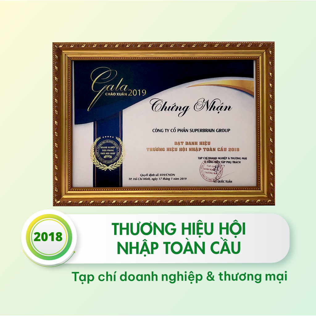 - Chứng nhận Danh hiệu “THƯƠNG HIỆU HỘI NHẬP TOÀN CẦU NĂM 2018”, do TẠP CHÍ DOANH NGHIỆP & THƯƠNG MẠI trao tặng