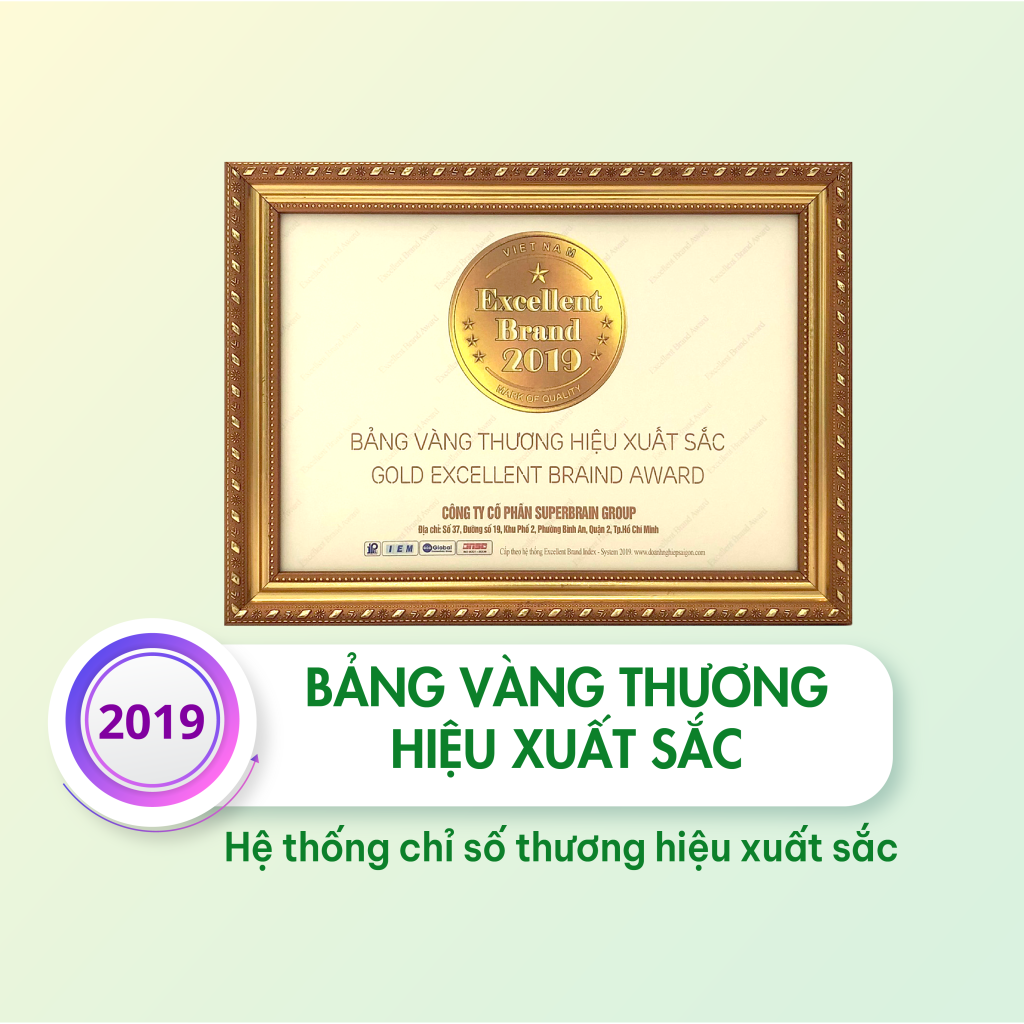 - Chứng nhận Danh hiệu “BẢNG VÀNG THƯƠNG HIỆU XUẤT SẮC” cấp theo HỆ THỐNG CHỈ SỐ THƯƠNG HIỆU XUẤT SẮC 2019.