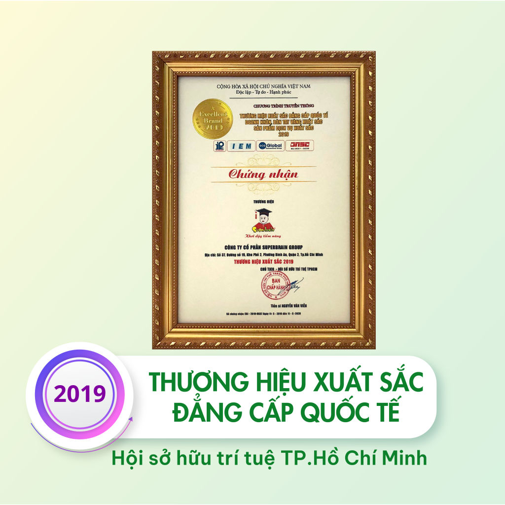 - Chứng nhận Danh hiệu “THƯƠNG HIỆU XUẤT SẮC ĐẲNG CẤP QUỐC TẾ 2019” do HỘI SỞ HỮU TRÍ TUỆ THÀNH PHỐ HỒ CHÍ MINH trao tặng