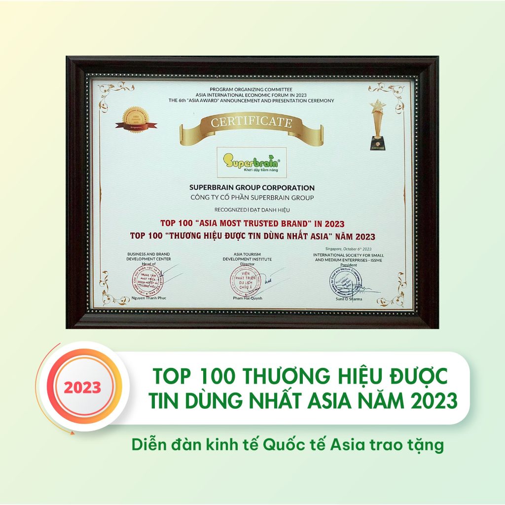 - Chứng nhận Danh hiệu “TOP 100 THƯƠNG HIỆU ĐƯỢC TIN DÙNG NHẤT ASIA NĂM 2023” do Diễn Đàn Kinh Tế Quốc Tế Asia trao tặng
