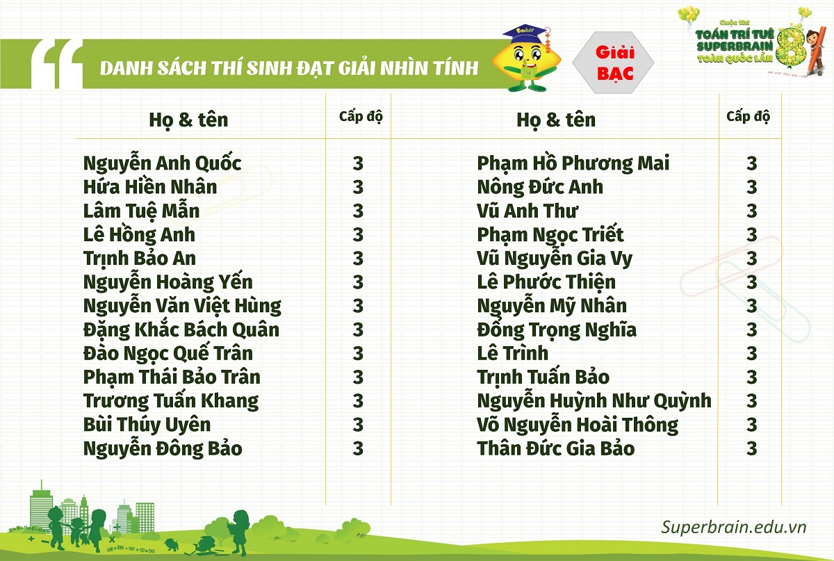Danh sách thí sinh đạt huy chương Bạc Nhìn tính – Cấp độ 3