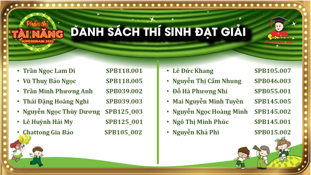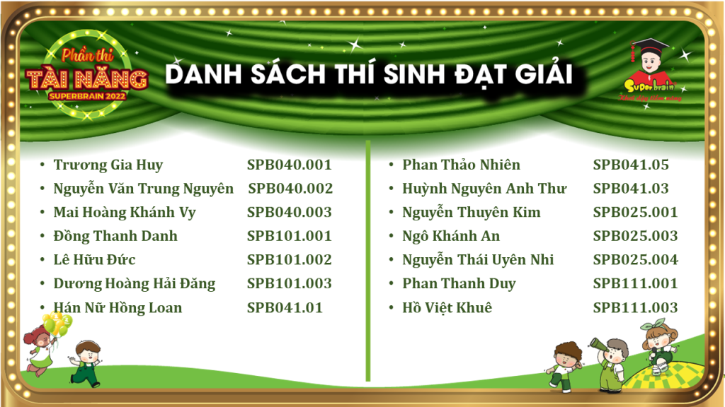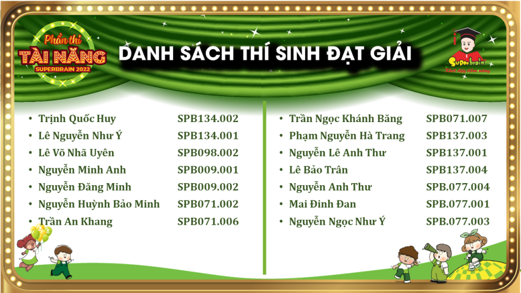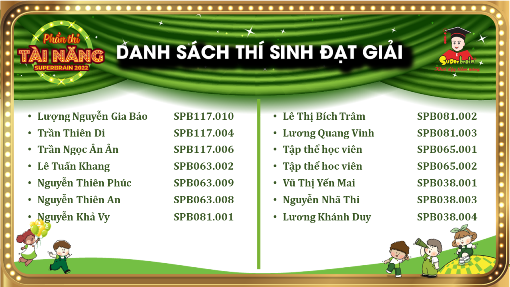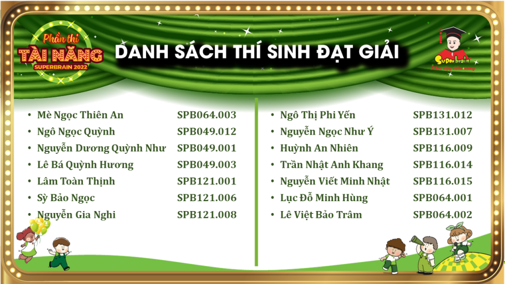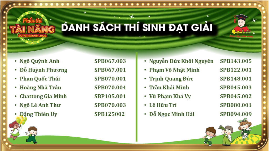 Các bạn có tên trong danh sách sẽ được trao giải trên sân khấu tại CUỘC THI TOÁN TRÍ TUỆ SUPERBRAIN TOÀN QUỐC LẦN 11 – NĂM 2022.